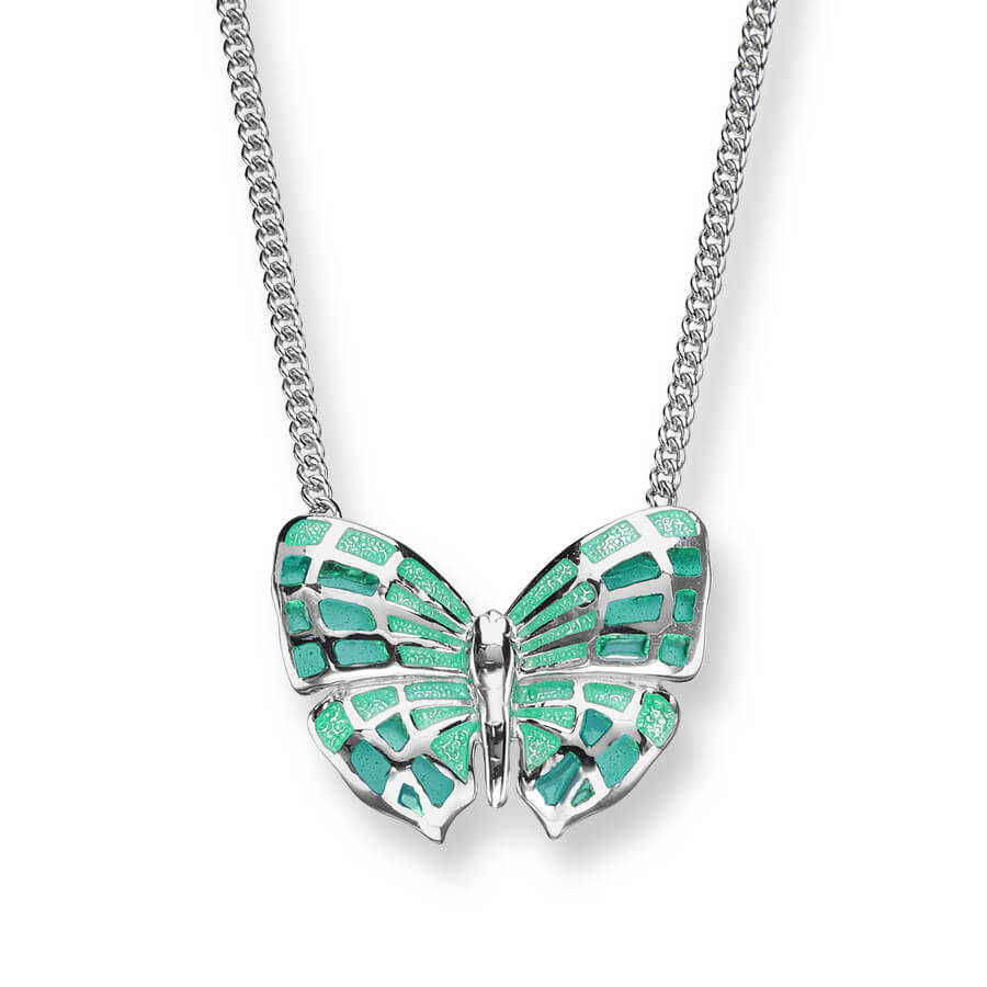 A beautiful enamel butterfly necklace. Vitreous Enamel provides a stunning colour to this Art Nouveau inspired necklace.