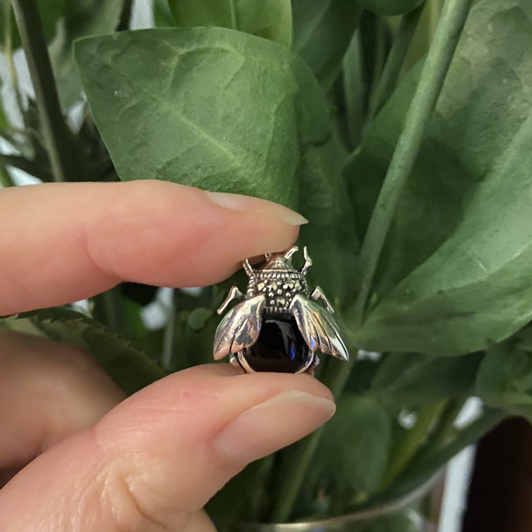 Bees represent brightness and personal power, the perfect present for the busy bee in your life. This beautiful brooch is crafted from Silver and set with Onyx. His little collar is set with sparkling Marcasite so he catches the light wherever you go. A secure roll clasp fastens this little chap securely to your clothes.
