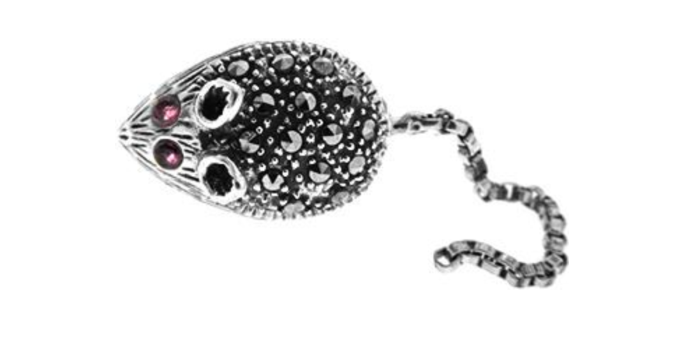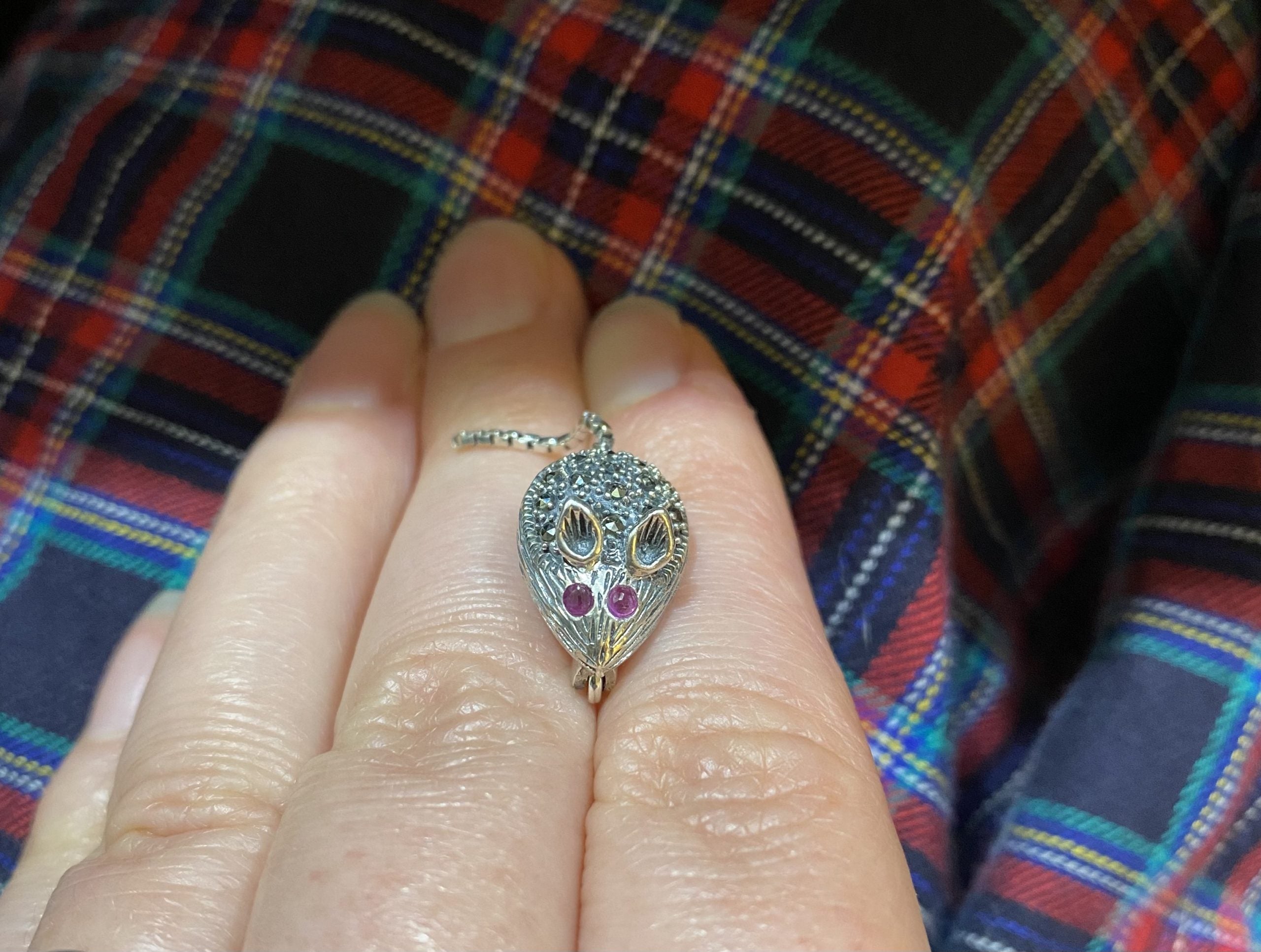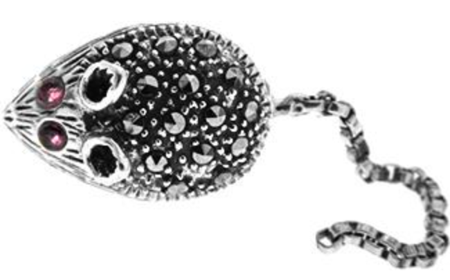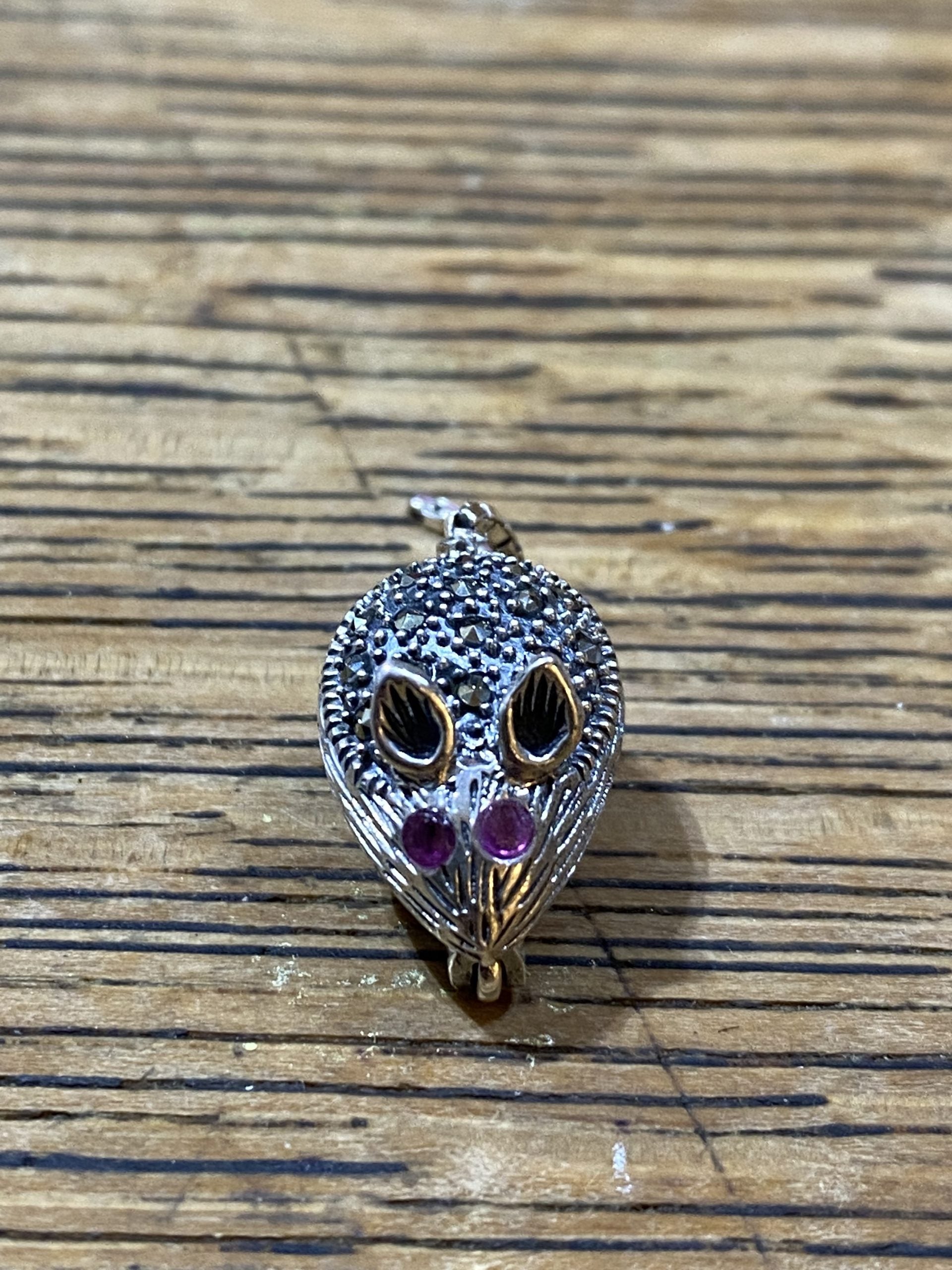 Tiny yet perfectly formed, this beautiful brooch is silver set with Marcasite. His sparkly eyes are Garnet which is the birthstone for January . He has a sweet little chain tail which moves when you do and a safety roll clasp.