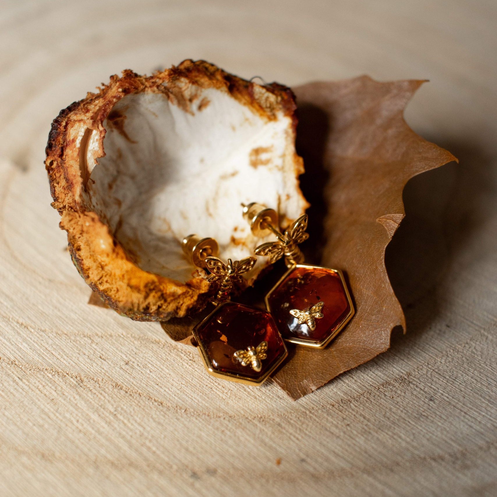 Golden Amber Honeycomb Bee Earrings