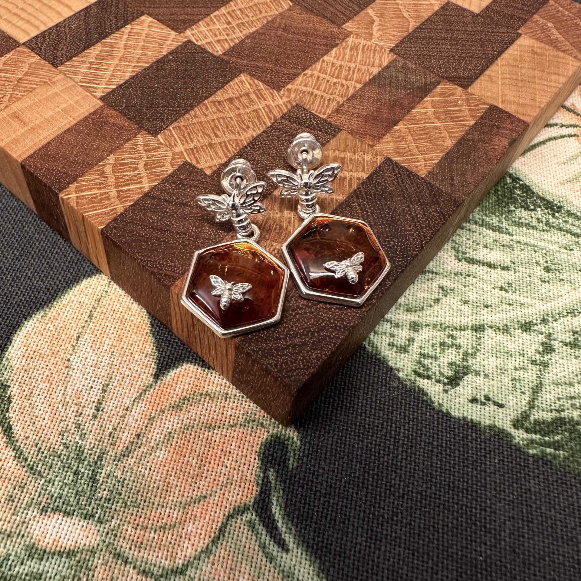 Silver Amber Honeycomb Bee Earrings