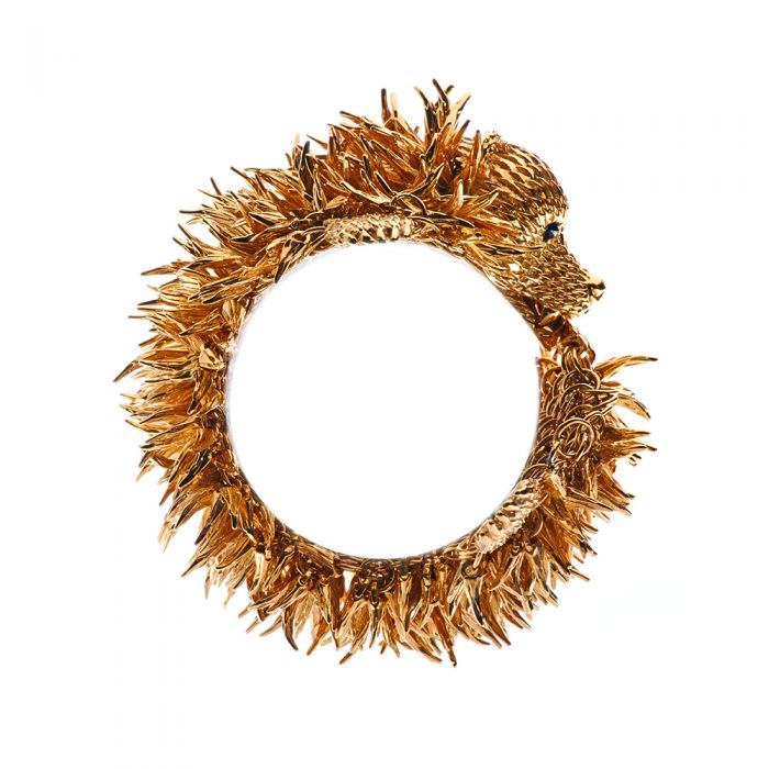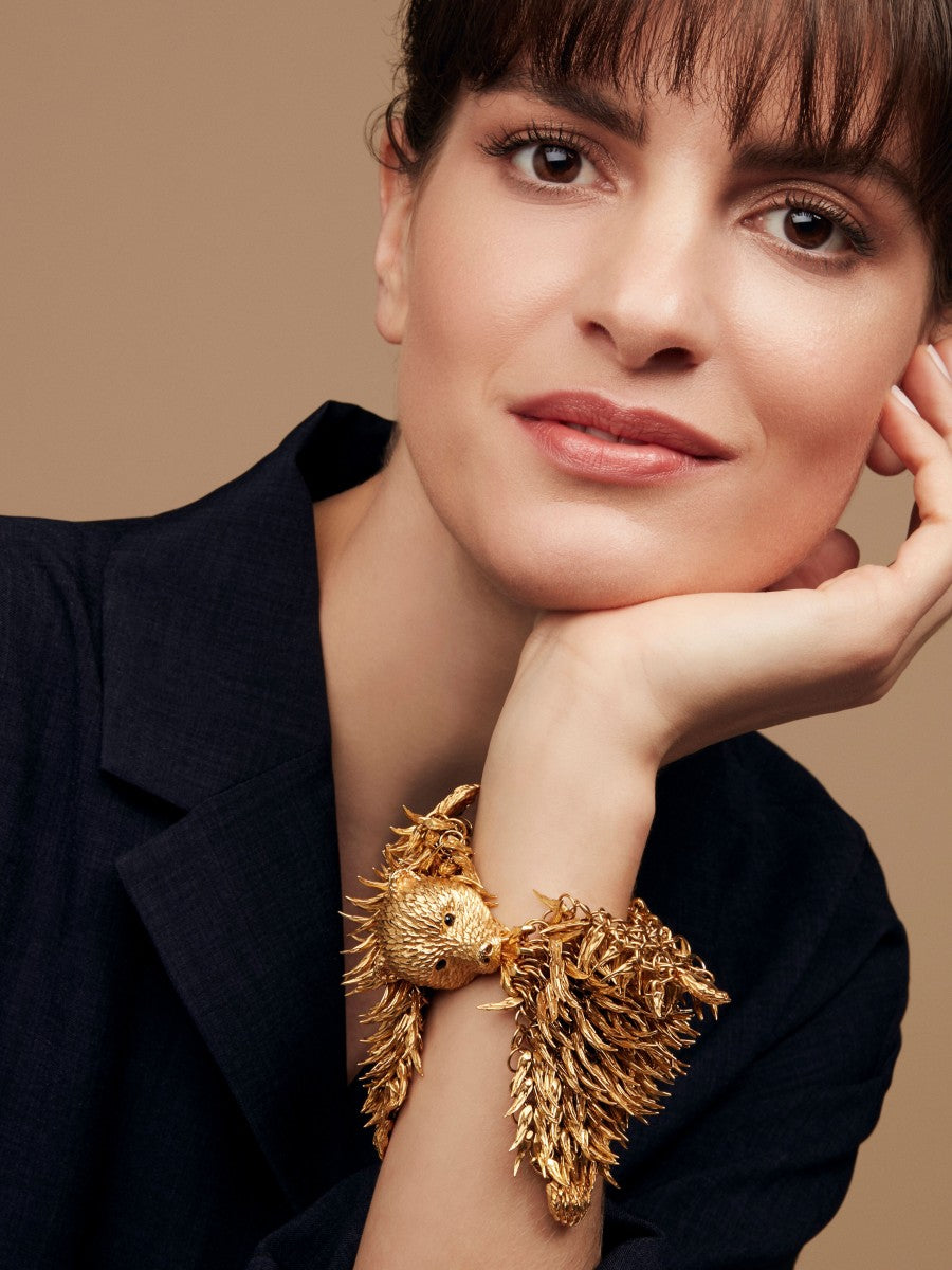 Created by Simon Harrison and chosen by Adorn. The 'bearskins' are made from delicately flexible chainmail. Tactile and very comfortable to wear, the glass eyes give this stunning chap real character. Over 500 tiny tufts of 'fur' gently move with every gesture of the body. The bracelet fastens via a sprung clasp in the bear's jaws which attached to his tail! Featured in the Fi cial Times 'How to Spend It' article in September 2018, this piece is impossible to wear without causing a stir!