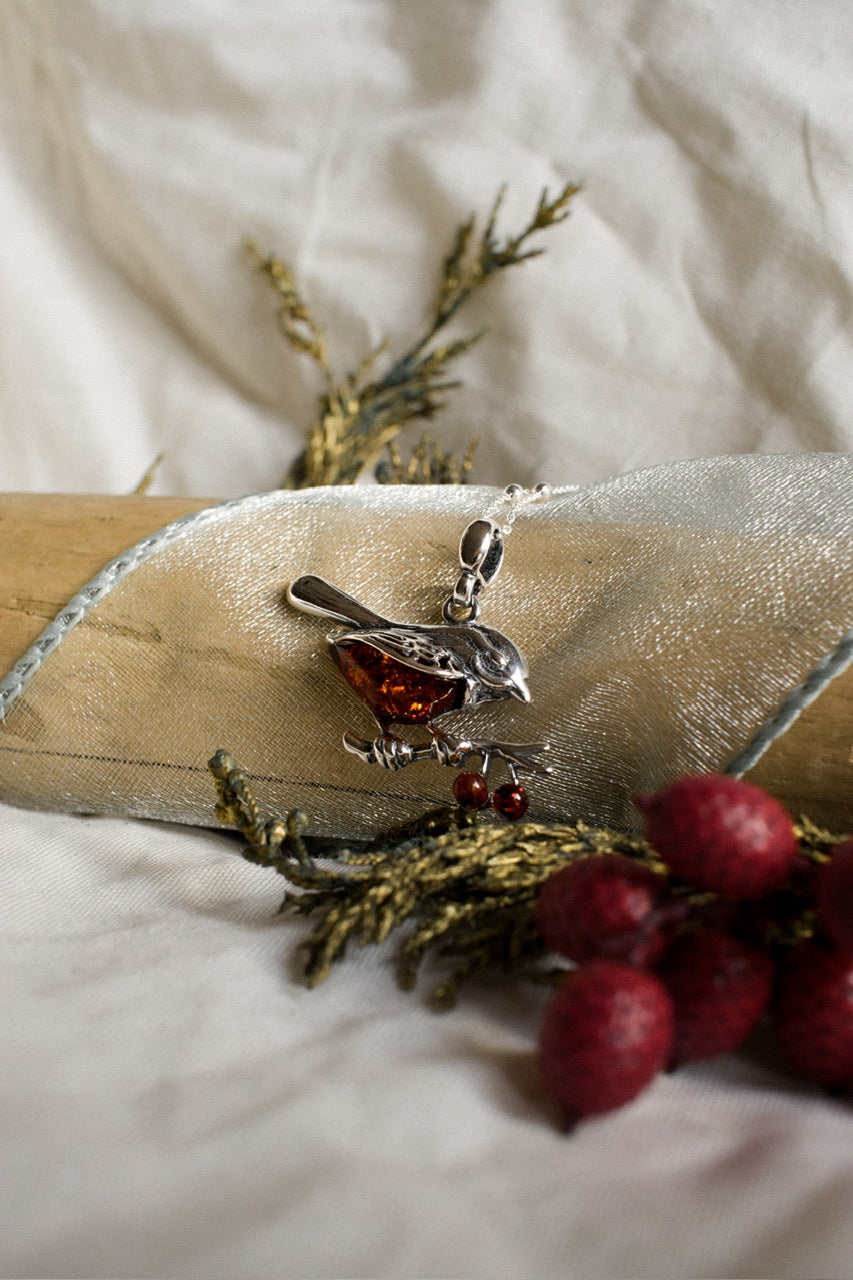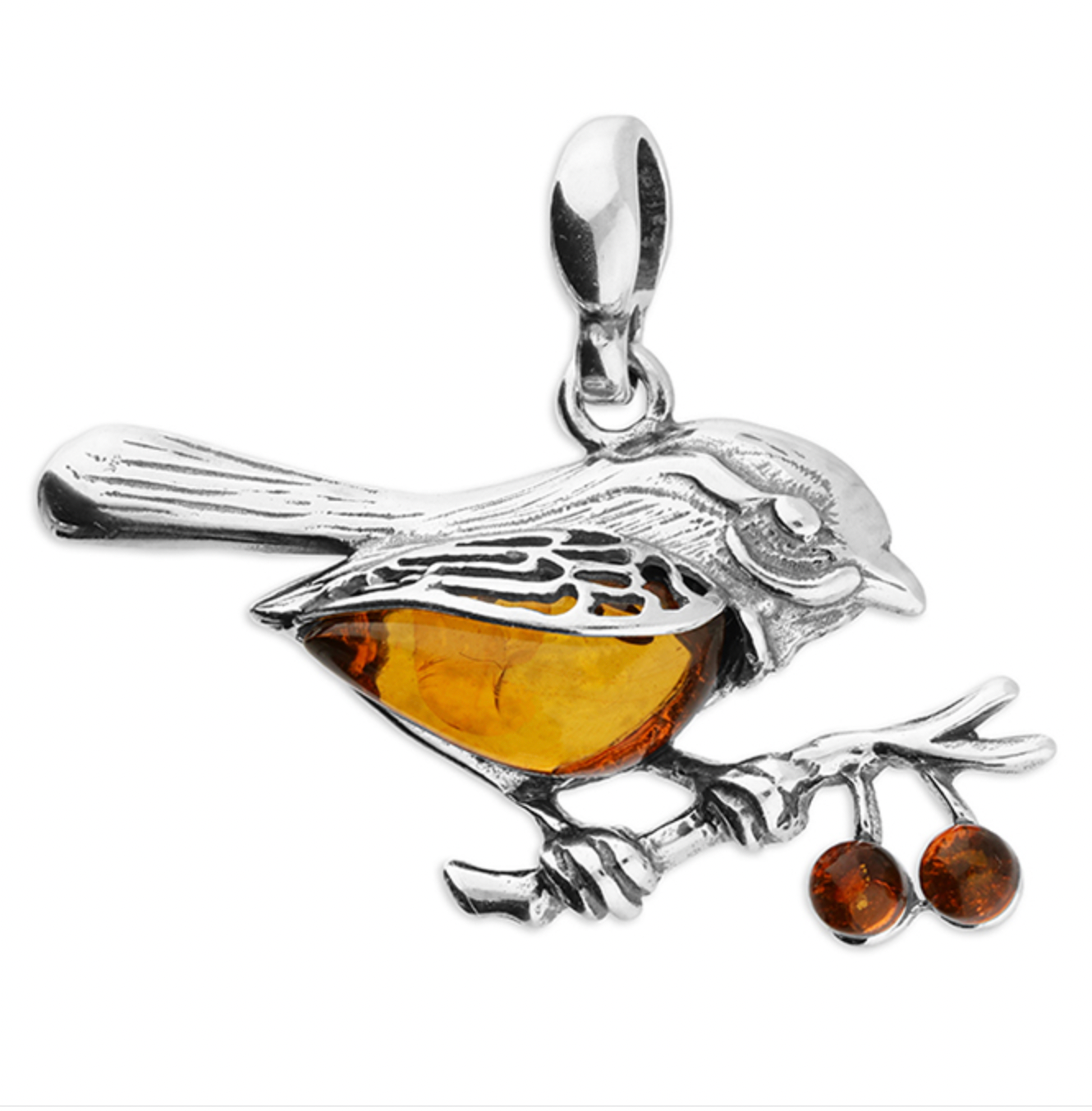 Your beautiful pendant is genuine Baltic Amber in the traditional cognac colour. She perches on a textured silver branch with Amber berries. She is presented on a silver chain, please choose your favourite length below.