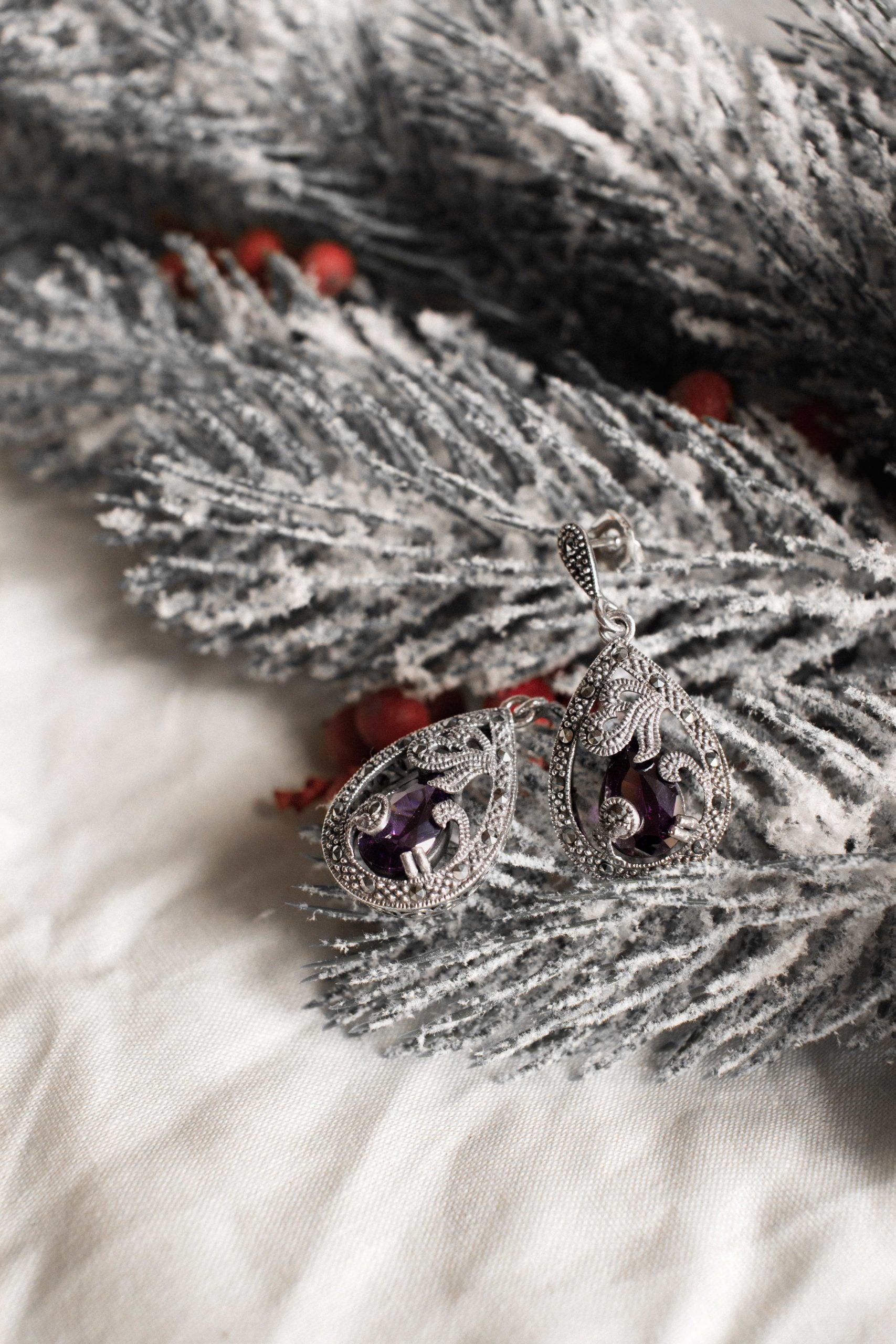 Purple Pear Marcasite Earrings