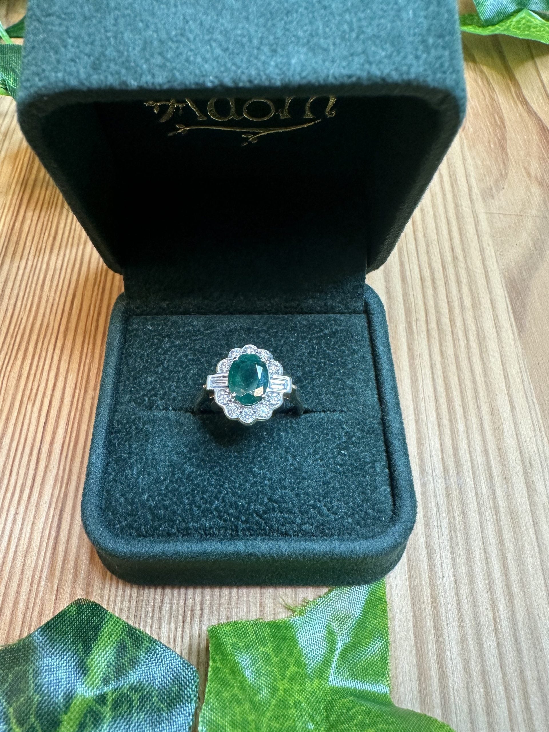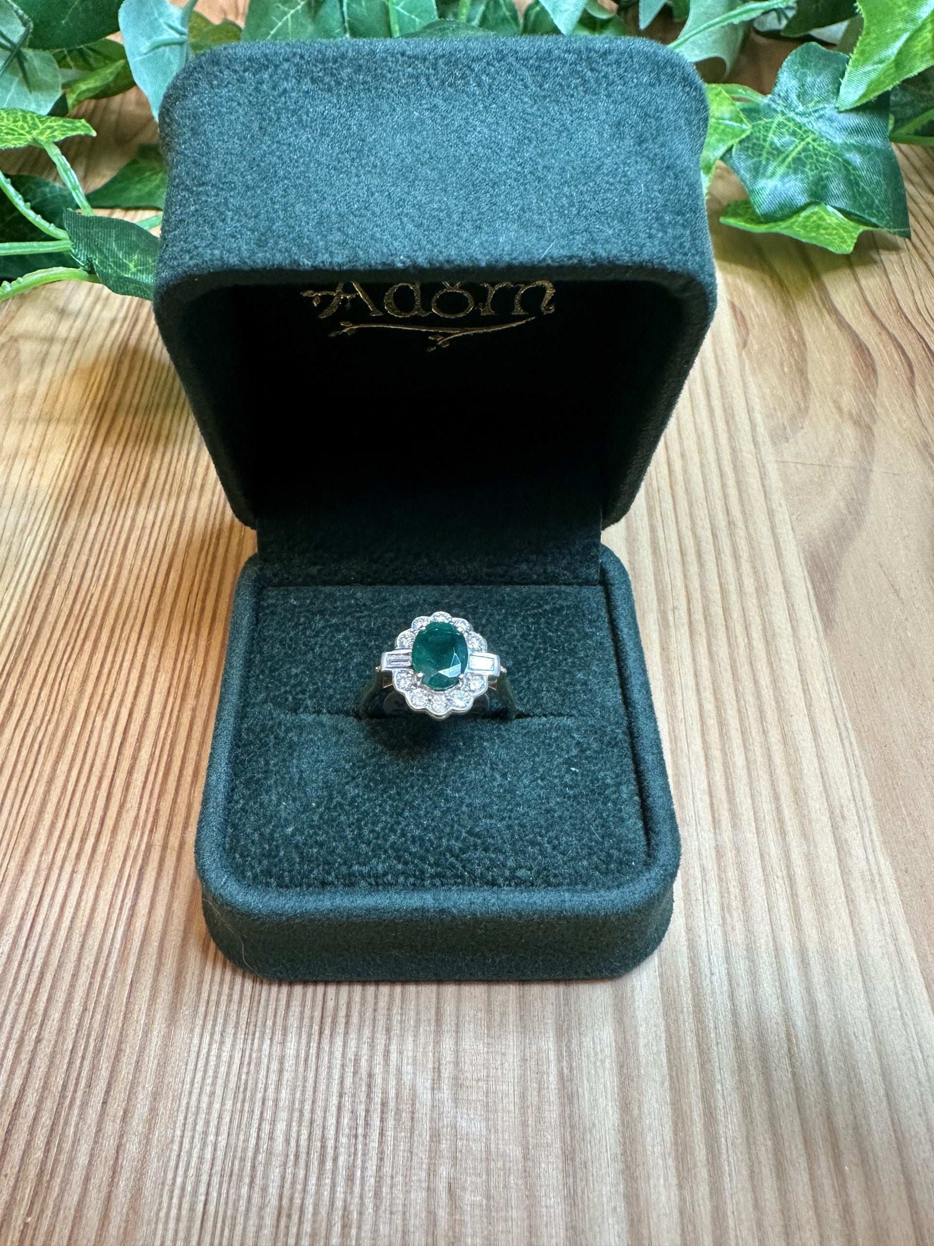A beautiful oval Emerald commands centre stage with a supporting cast of beautiful, natural diamonds.