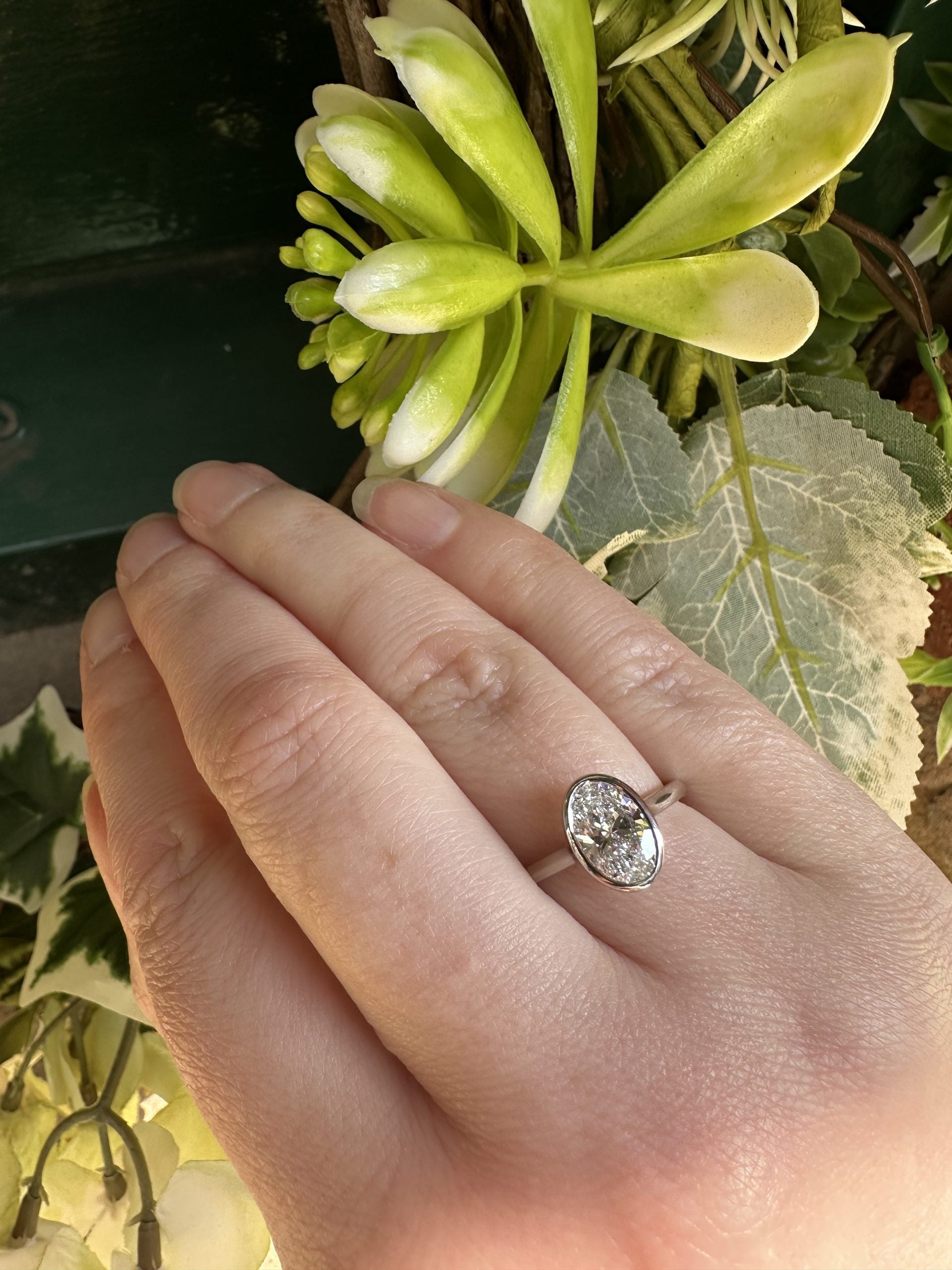 A stunning lab grown oval diamond set into precious platinum.