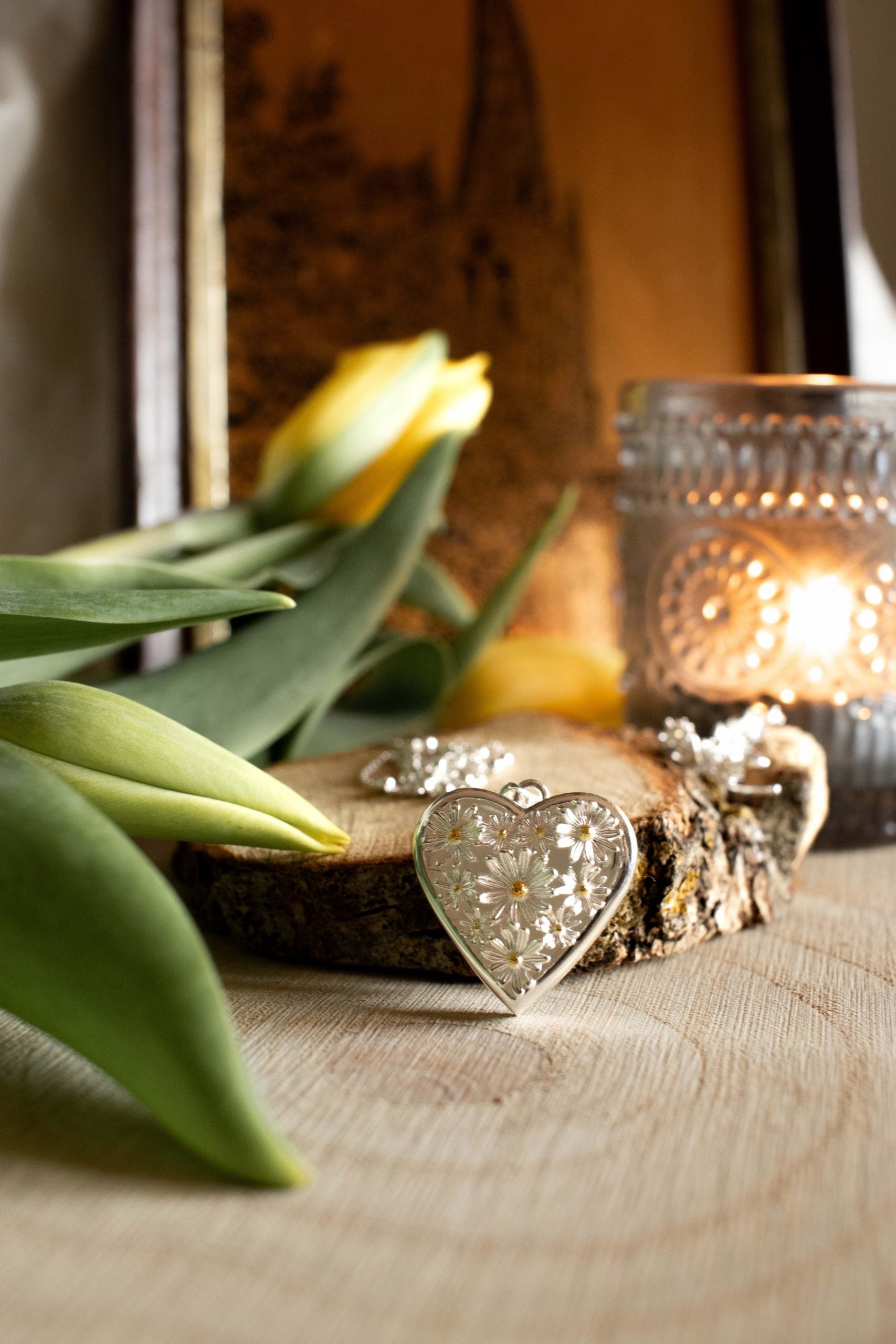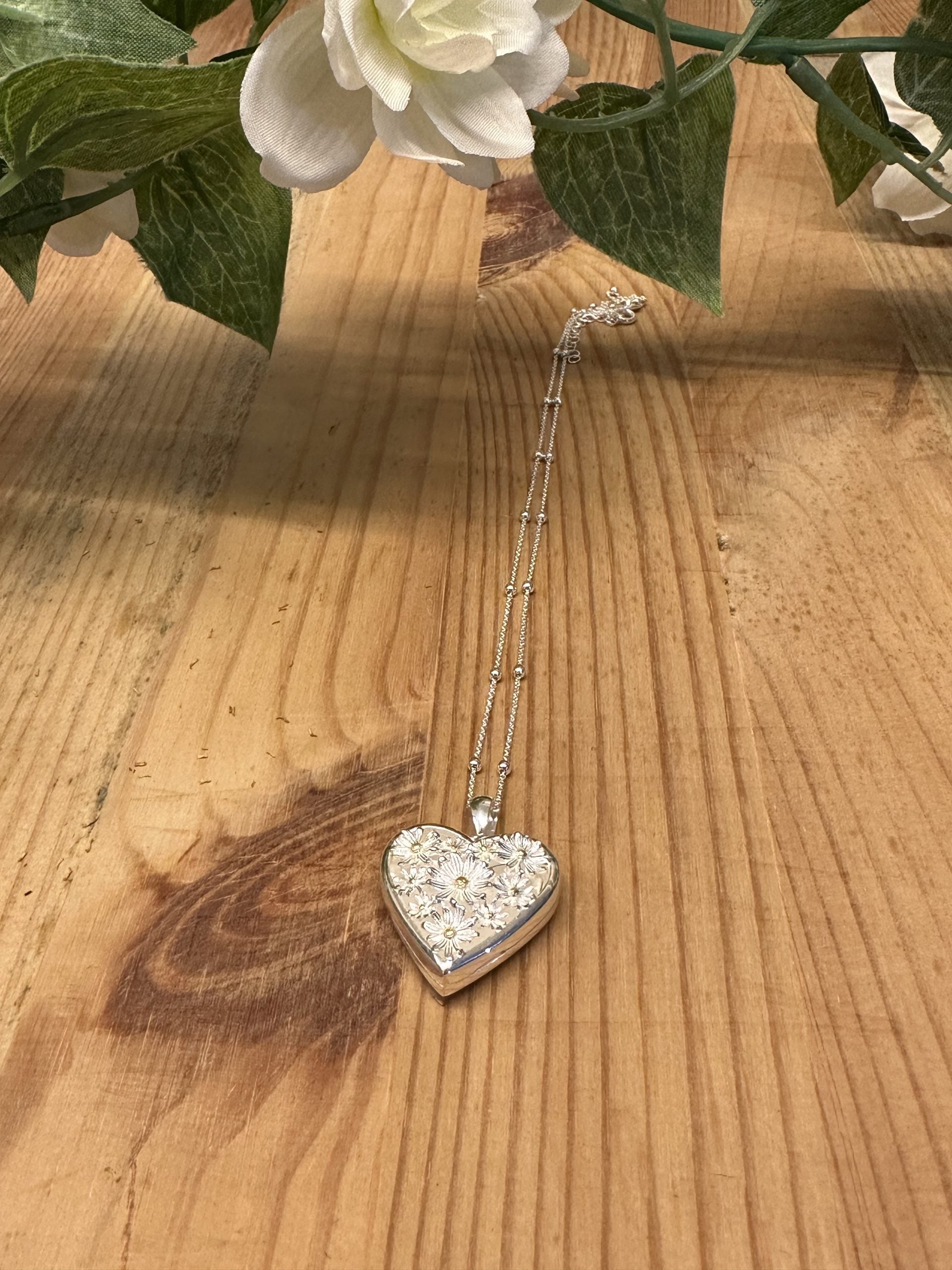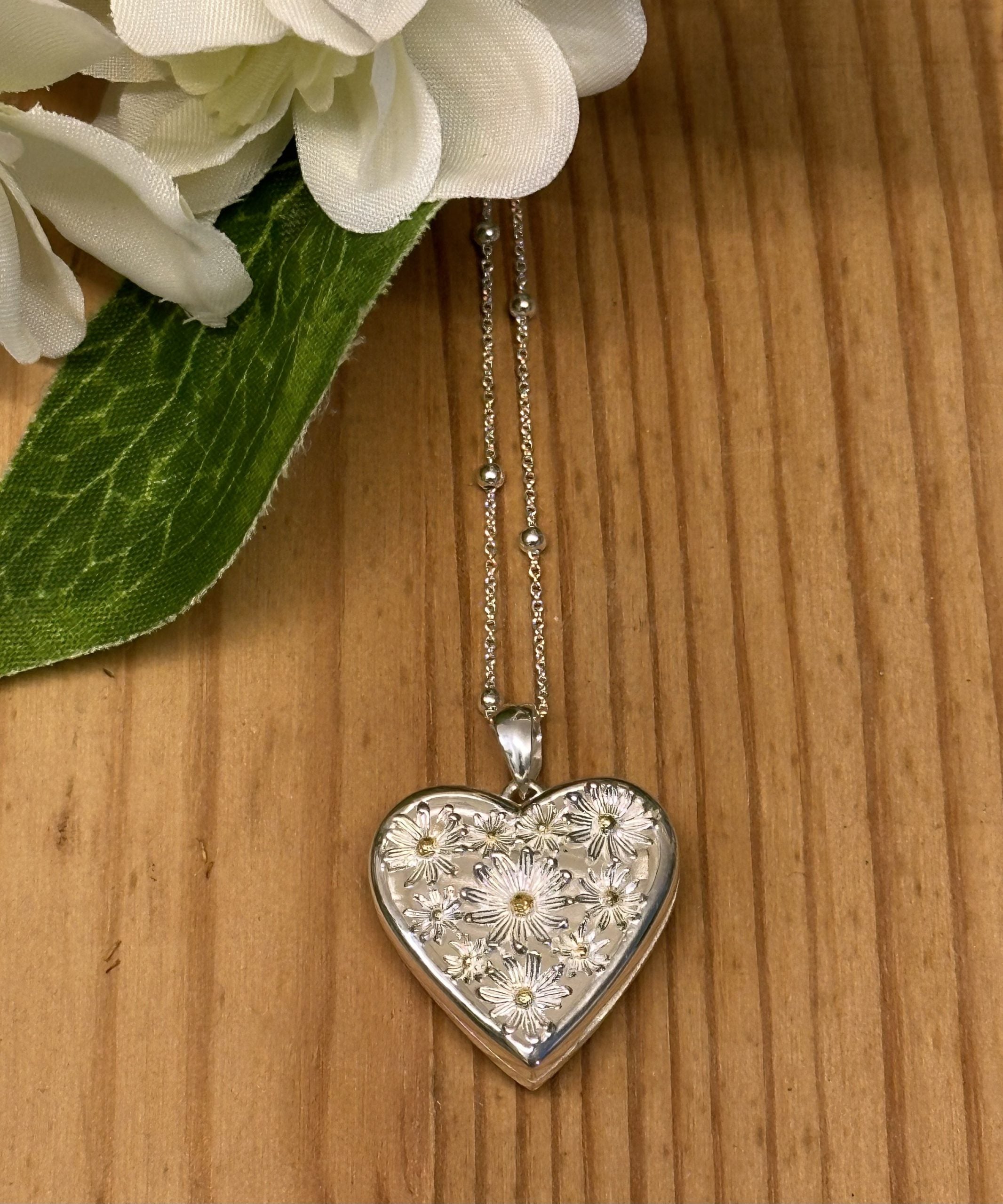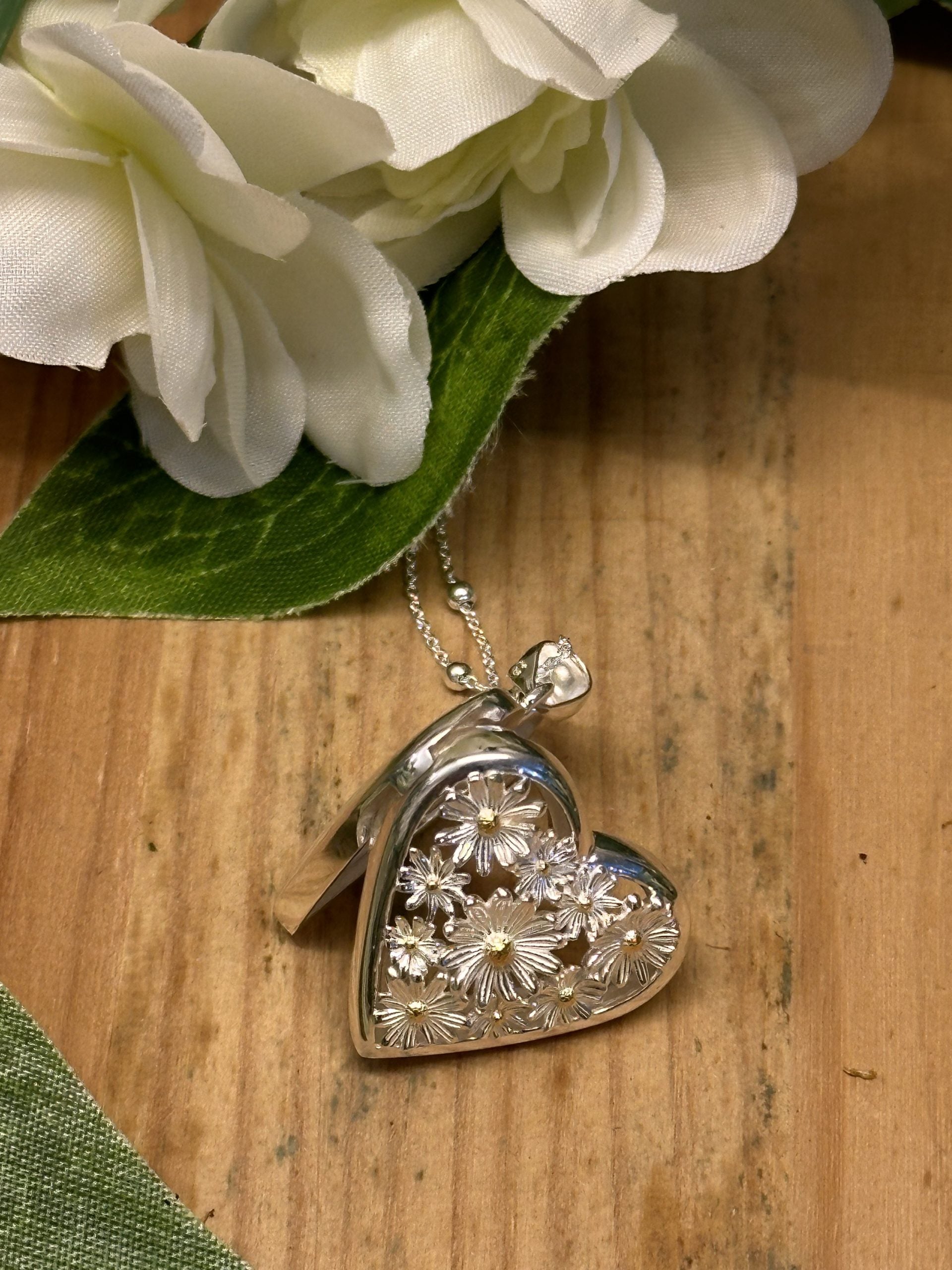 Our Daisy Heart Pendant features a daisy with a dangly silver heart.