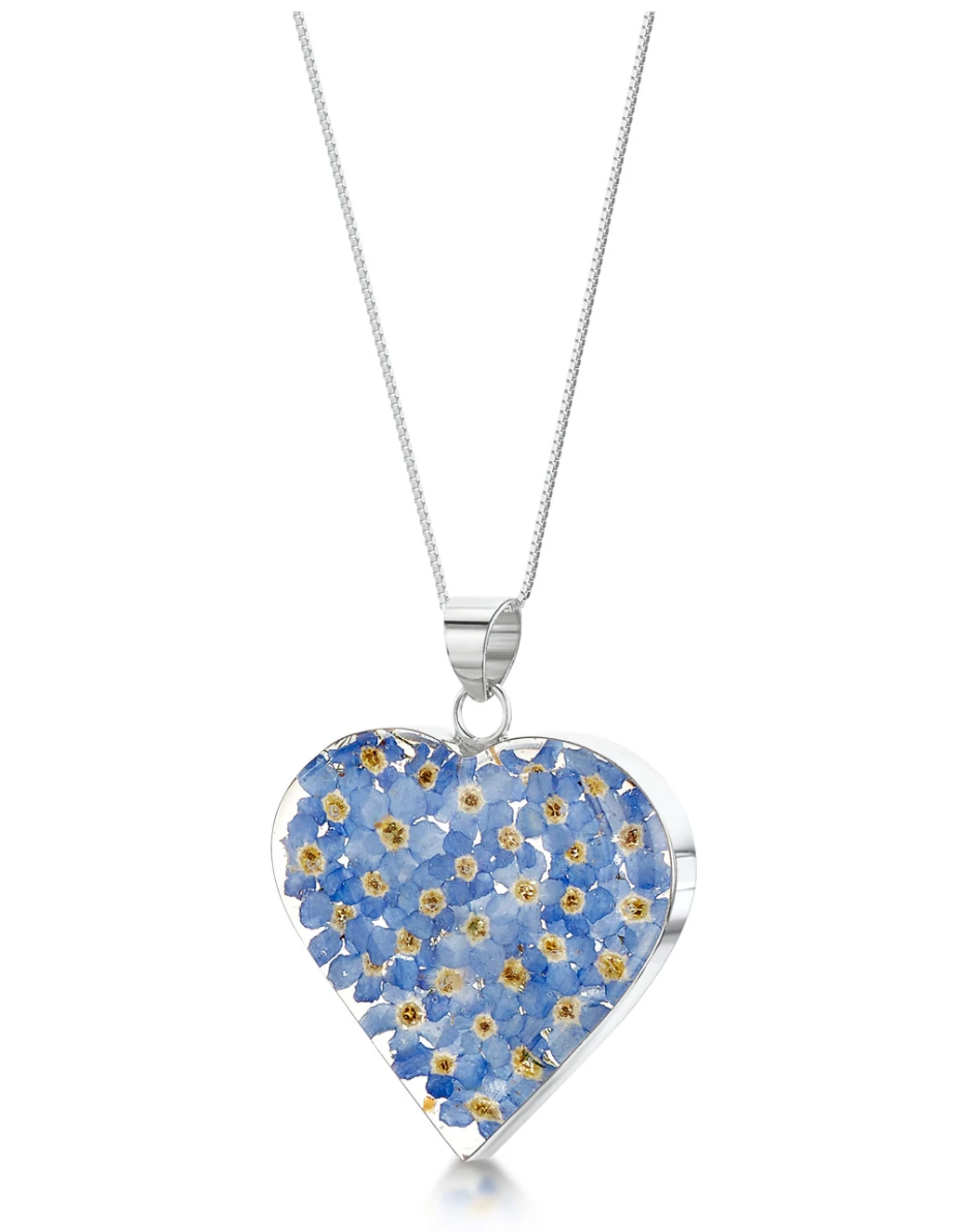 Made with real forget-me-not flowers, set in a resin and mounted on silver. Presented on an 18"/45cm silver chain. Each pendant is made with real flowers meaning it is as unique as you are!