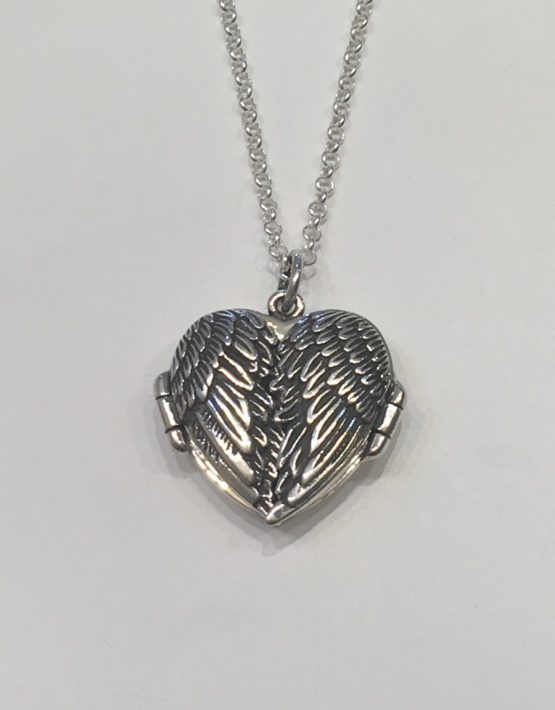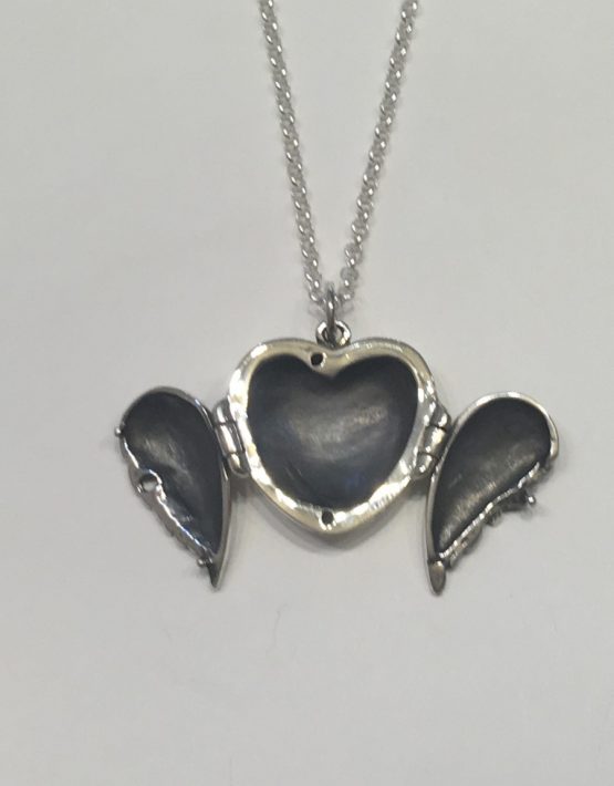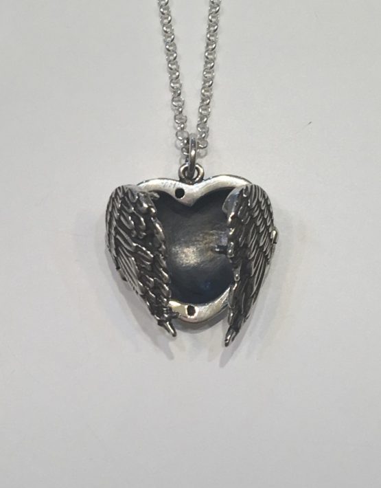 This beautiful Angel Wings Locket is perfect for keeping your most treasured photo or locket of hair close to your heart. Each Angel wing opens individually then folds together to enclose the heart shaped locket. The locket is created in sterling silver.
