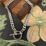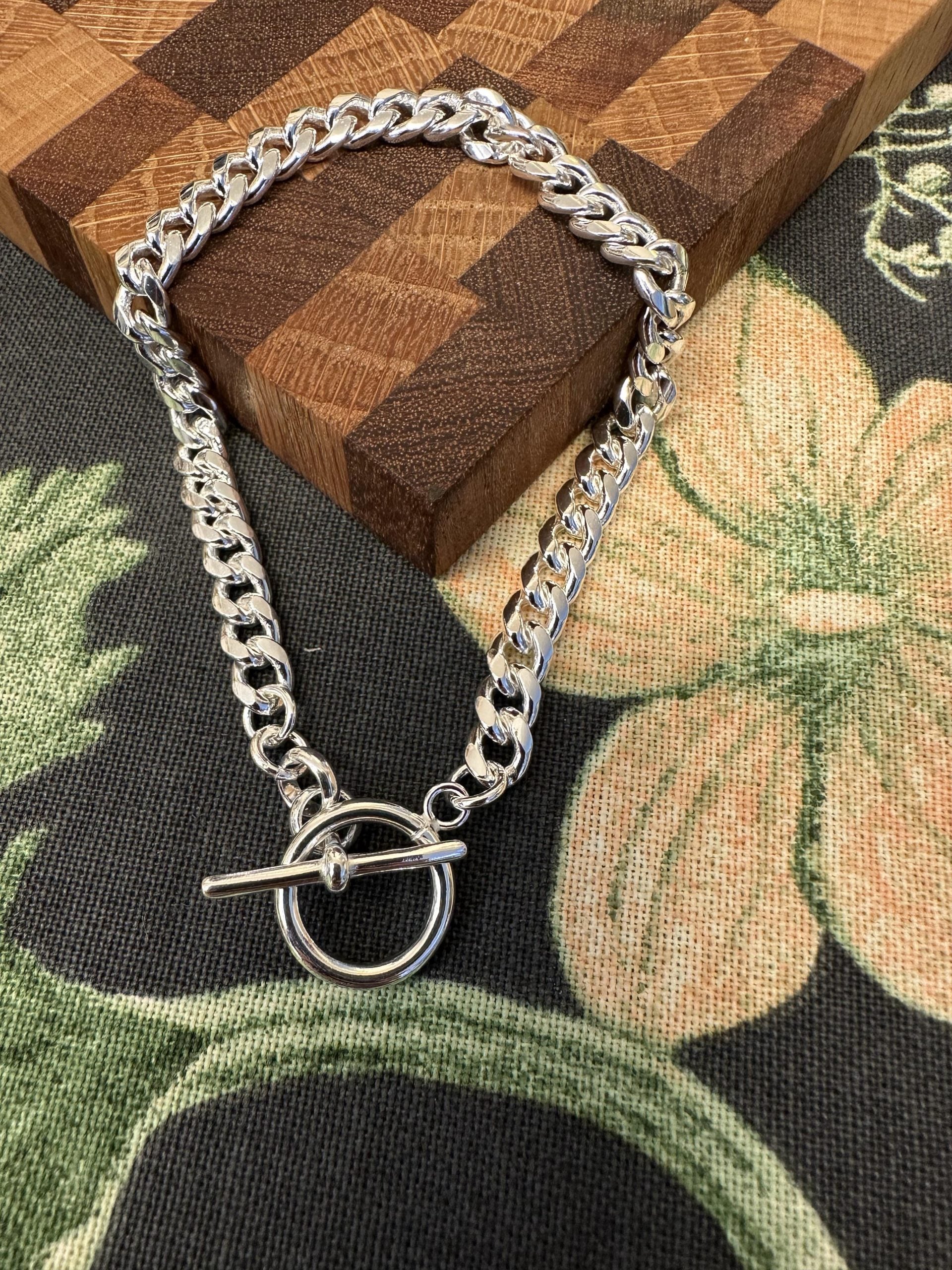 A chunky Cuban link bracelet with a T-Bar clasp and decorative T-Bar