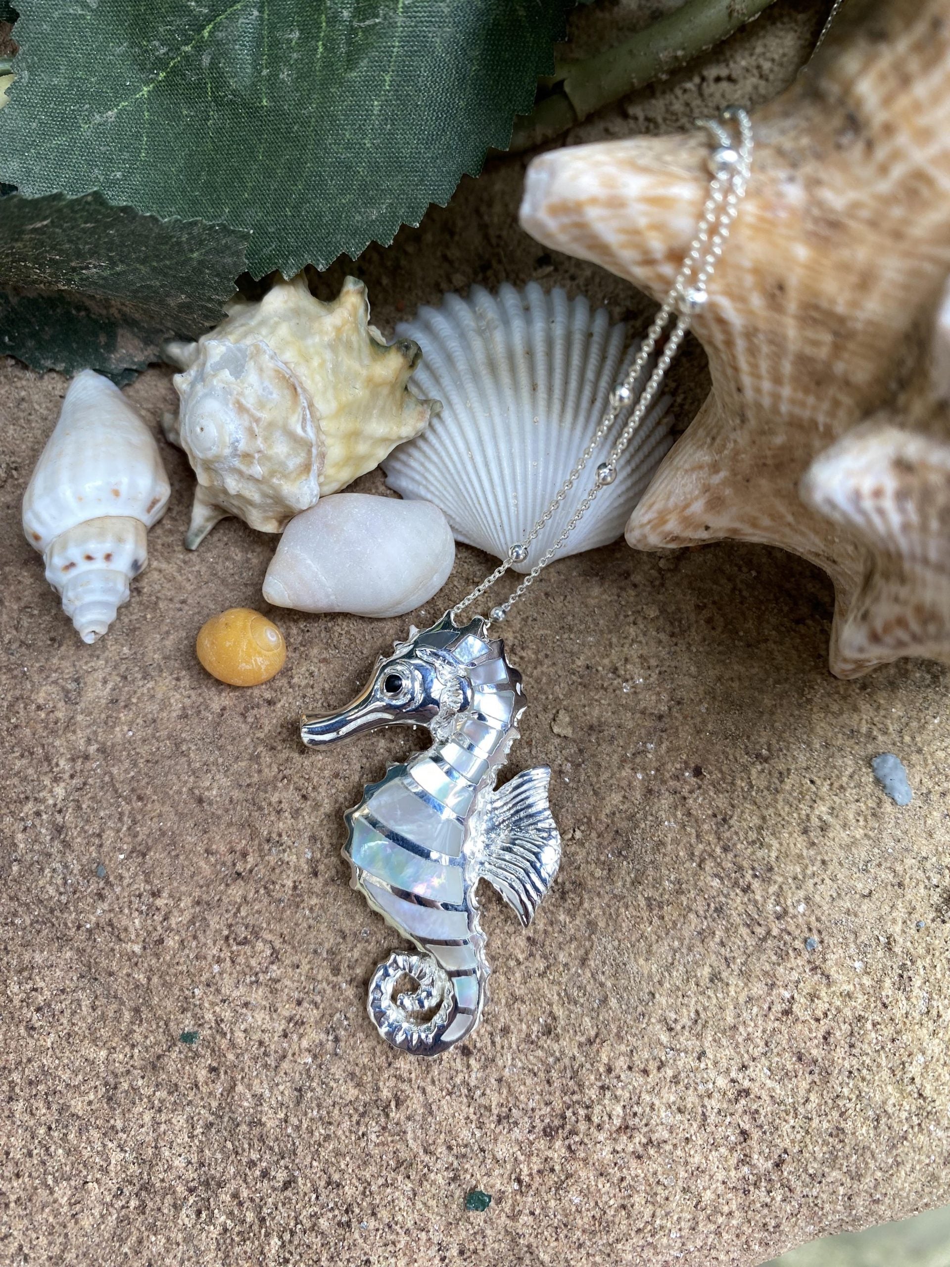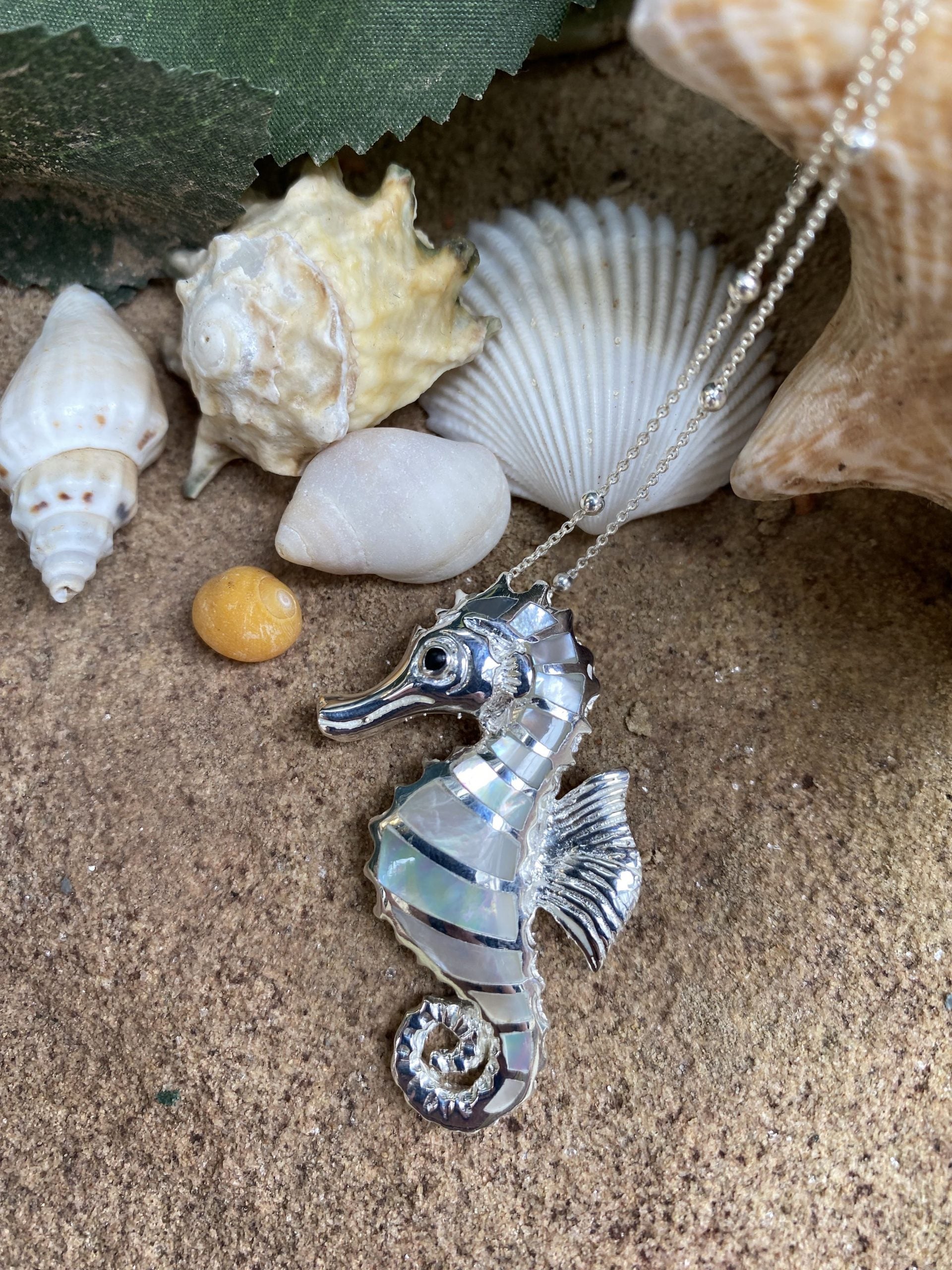 Your beautiful seahorse is silver set with beautiful Mother of Pearl. She’s presented on our super popular dotty chain, please choose your favourite length below..