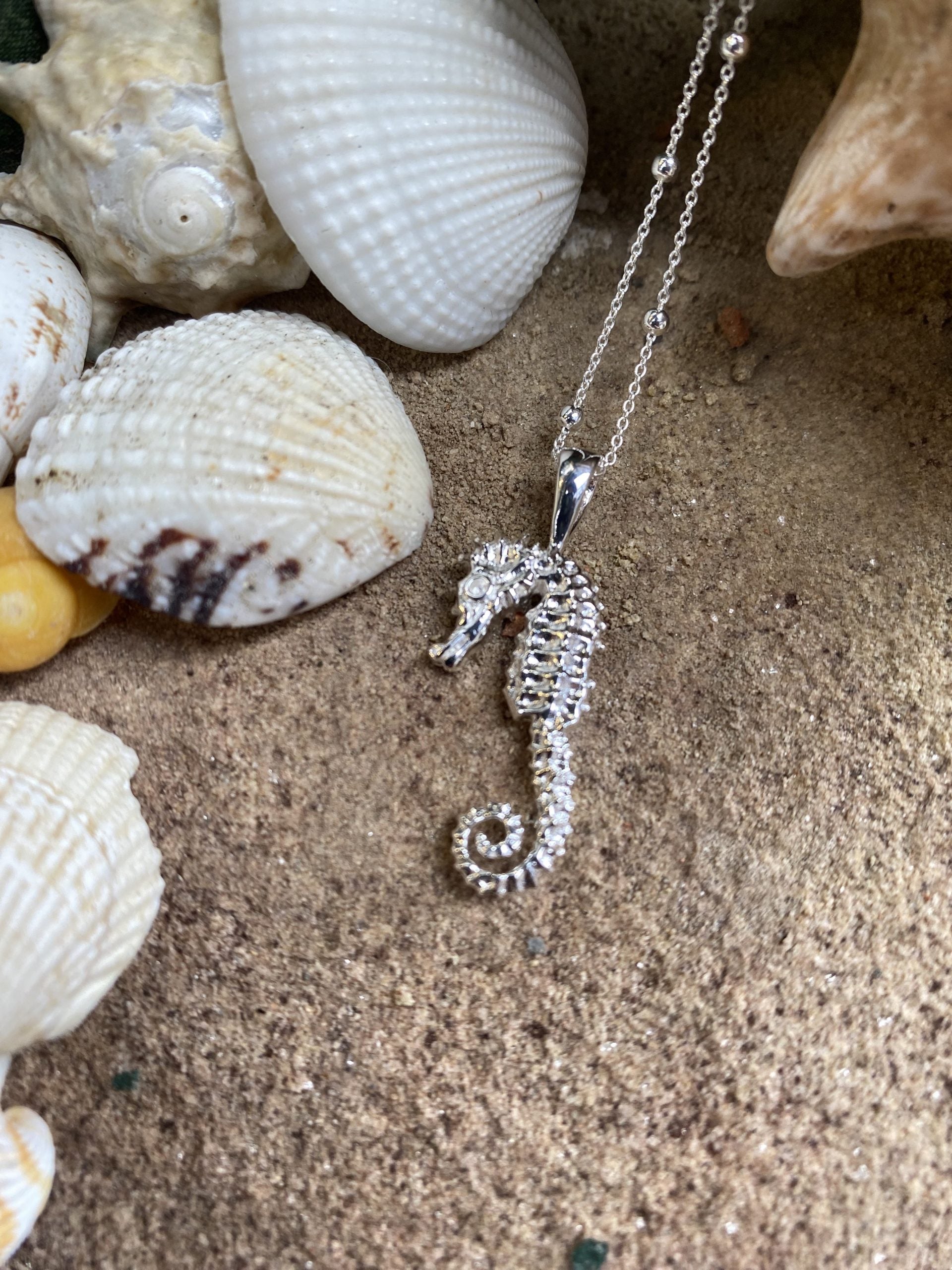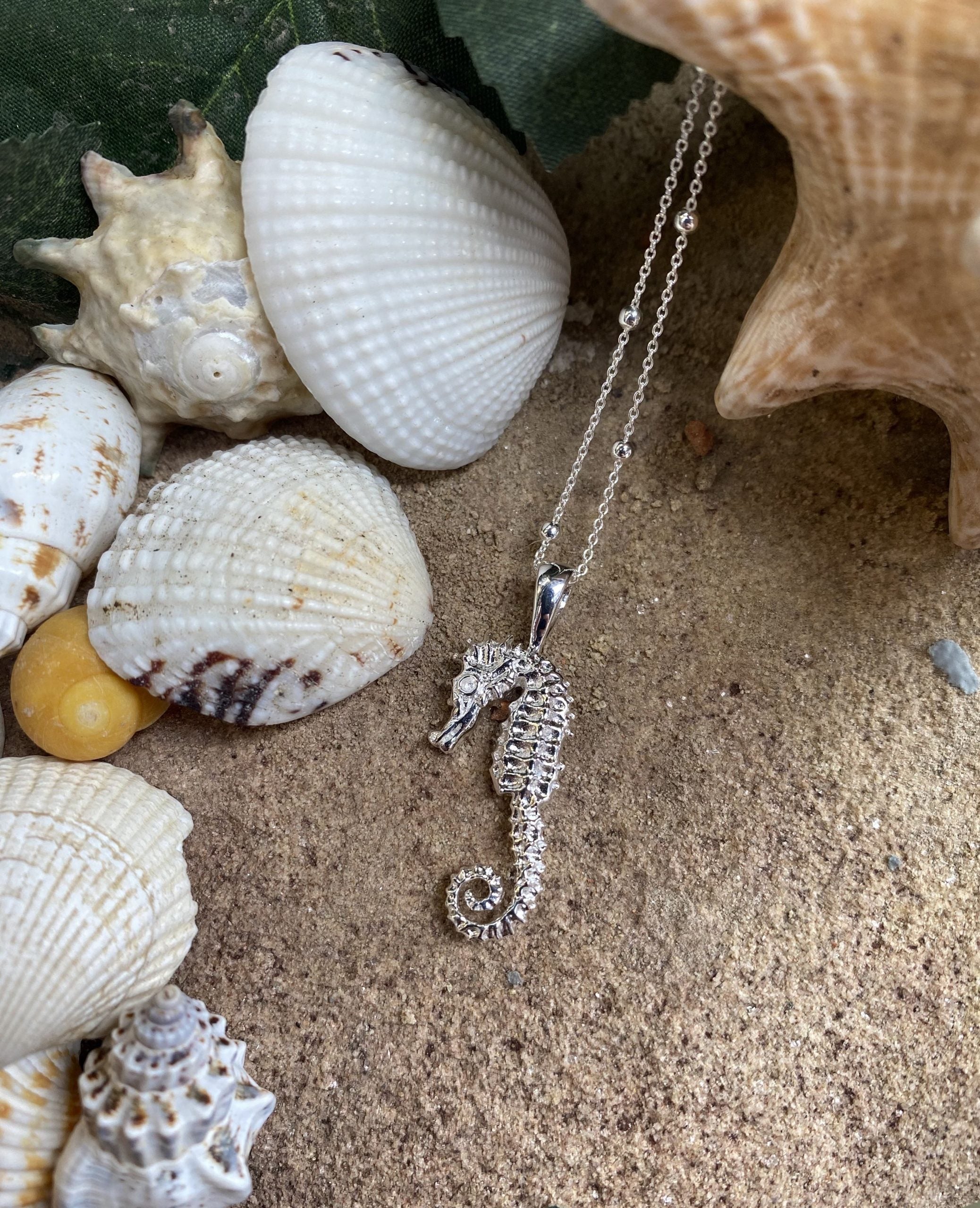 Your beautiful seahorse is textured silver. She’s presented on our super popular dotty chain, please choose your favourite length below...