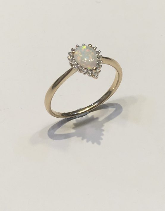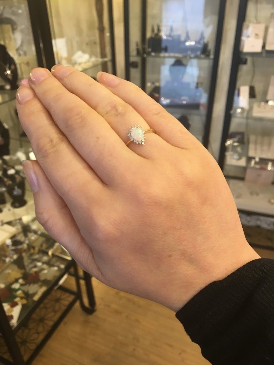 The Pear Shaped Opal is surrounded with accent Diamonds to really show off the colours in the Opal.