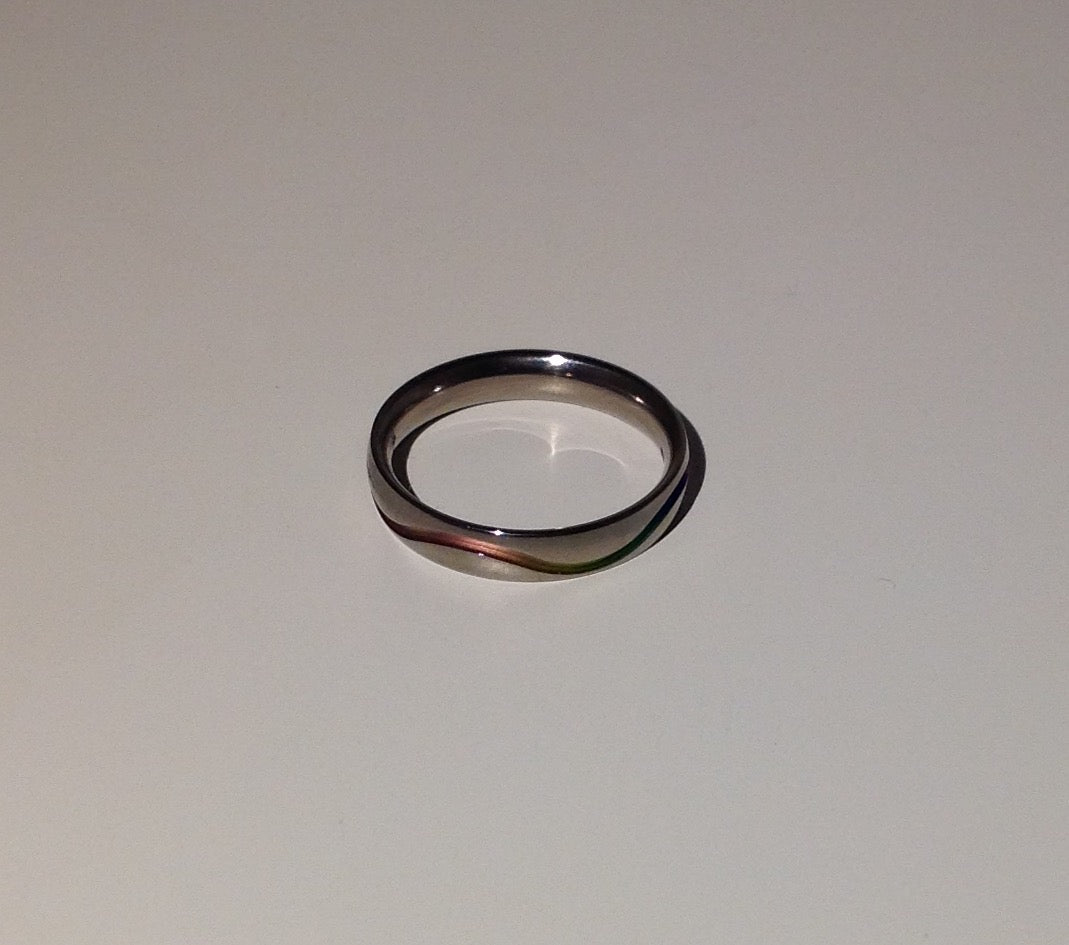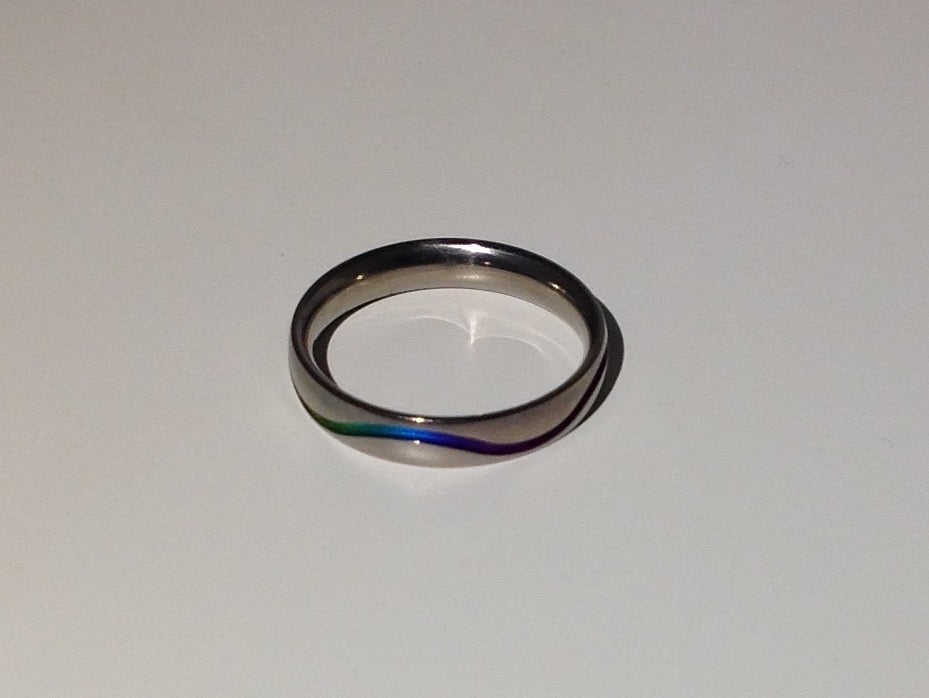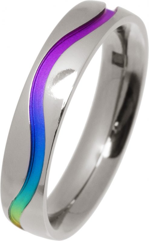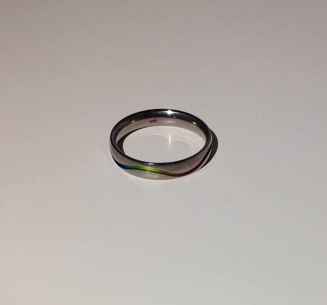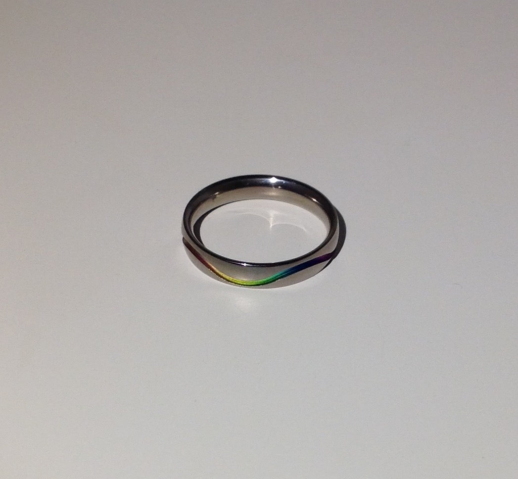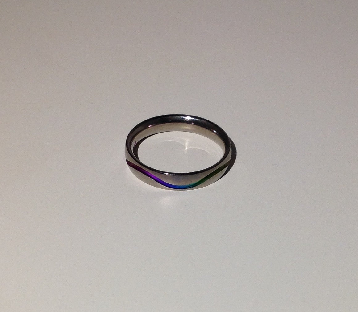 Passing a current through Titanium gives it a different colour and for this ring we've chosen a rainbow effect.