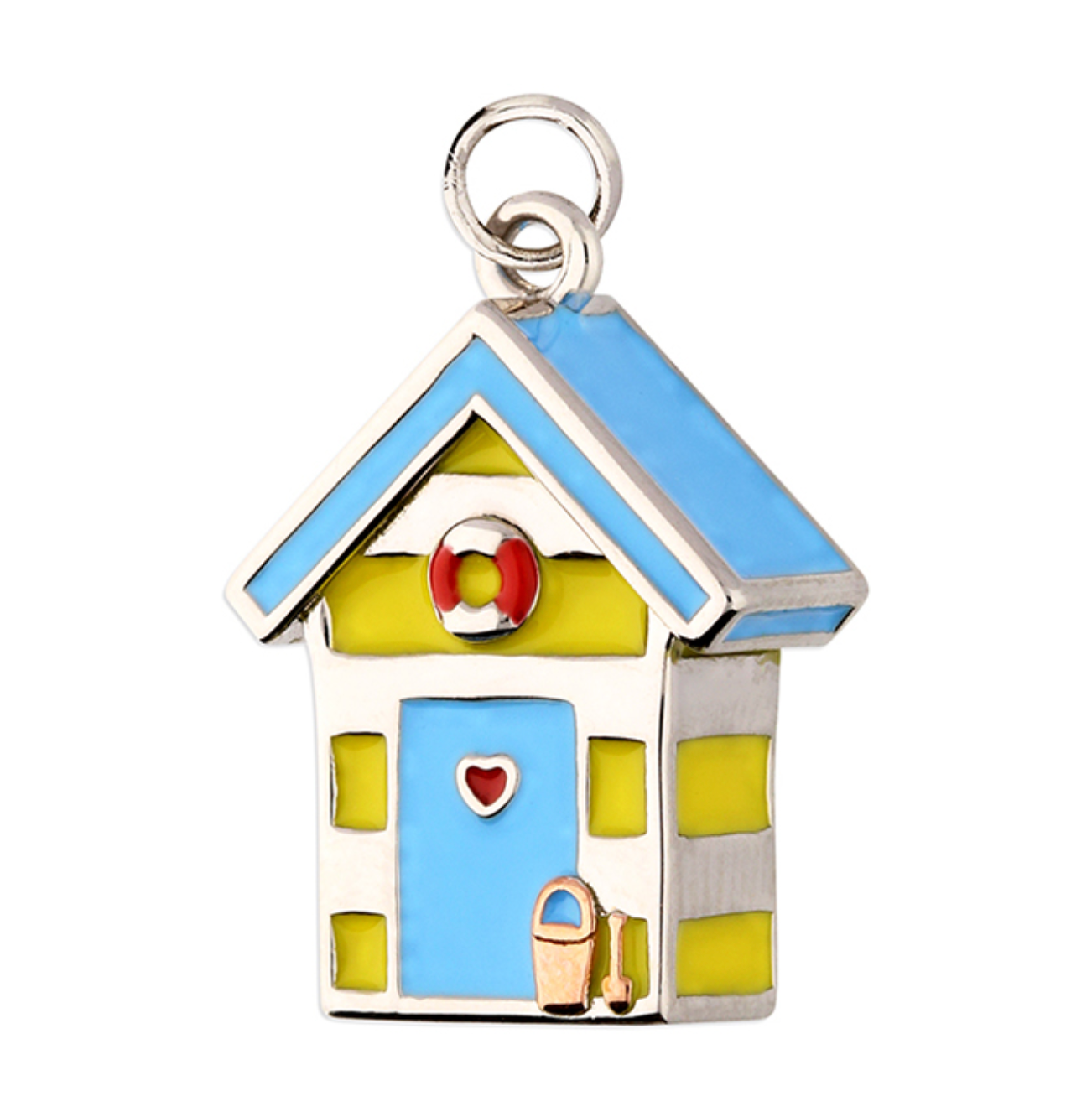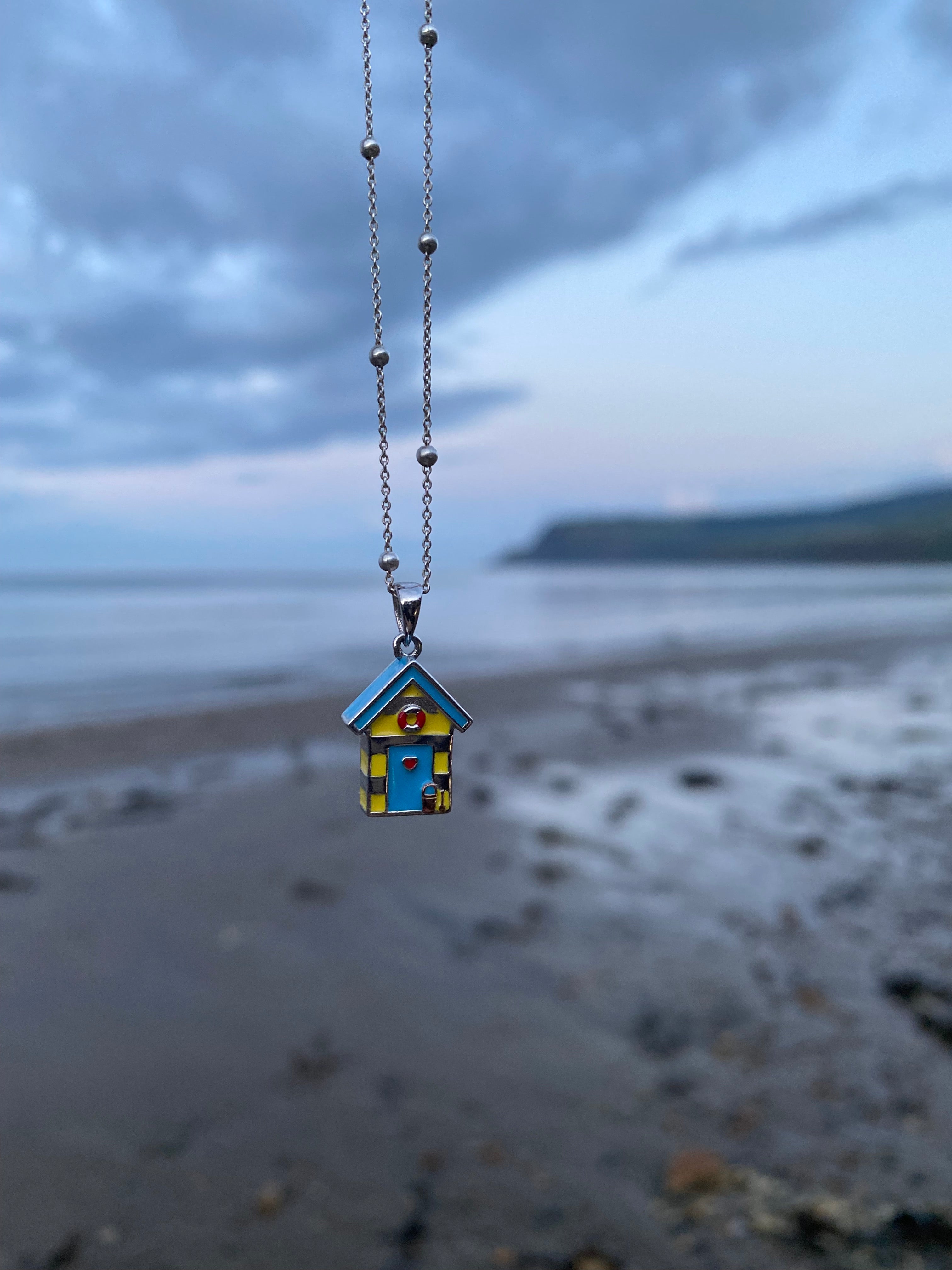A writers retreat, artists cabin or just somewhere to disappear and daydream. This sweet little silver and enamel pendant is so cheerful. The tiny rose gold finish details, a tiny bucket and spade by the door, are delightful. Finished with a red heart on the door and a silver chain.