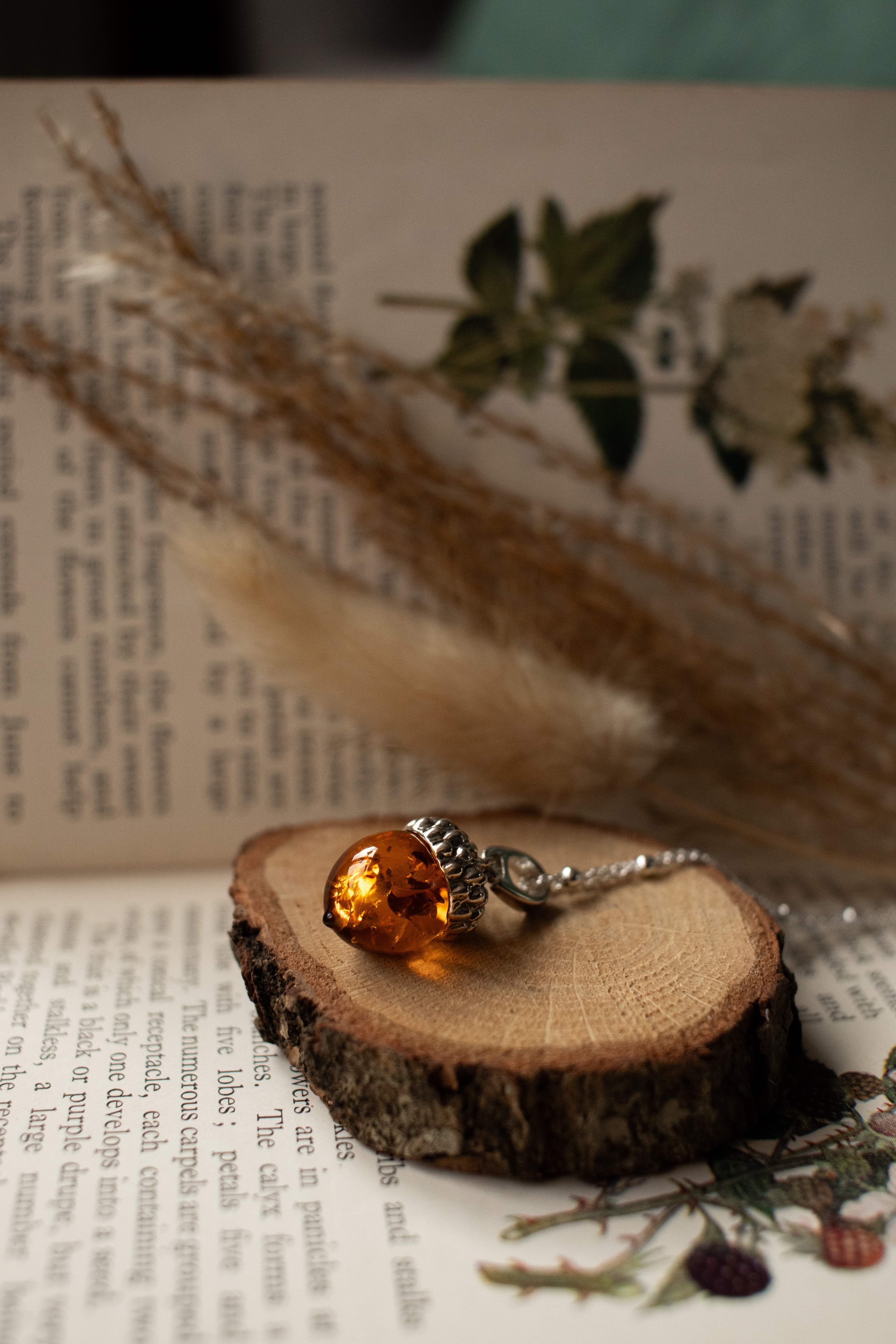 Our stunning amber acorns have a smooth, shaped piece of amber with a silver cupule (hat).