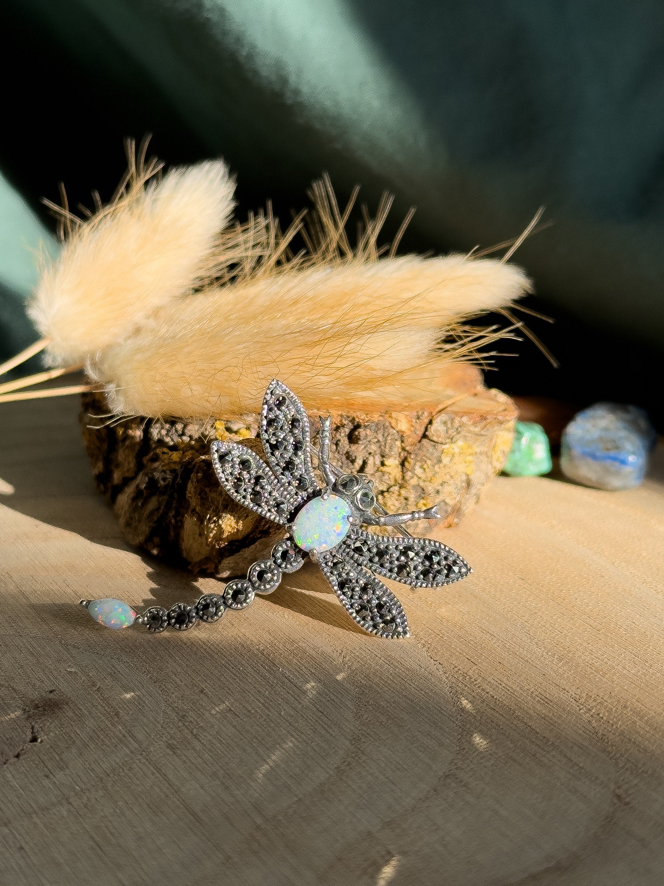 Our fabulous small Marcasite and Opalite Dragonfly Brooch. Representing change, transformation, adaptability and self realisation.