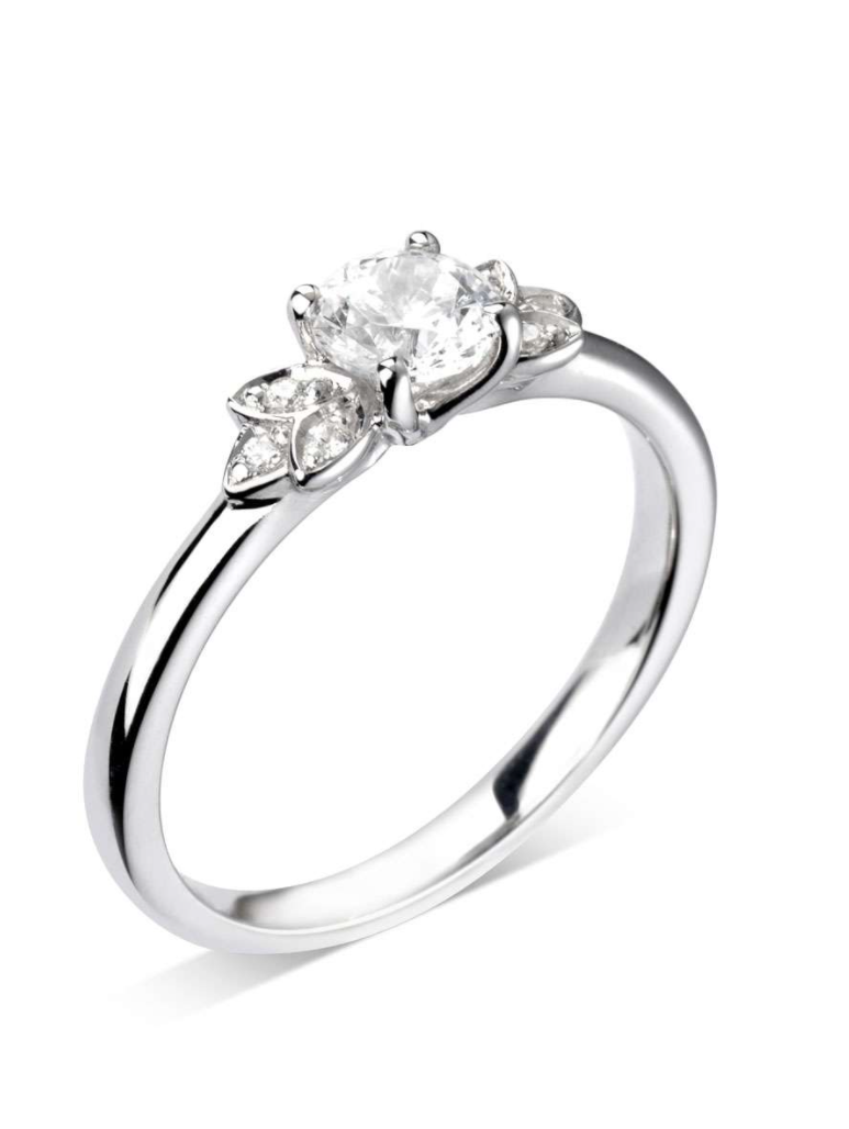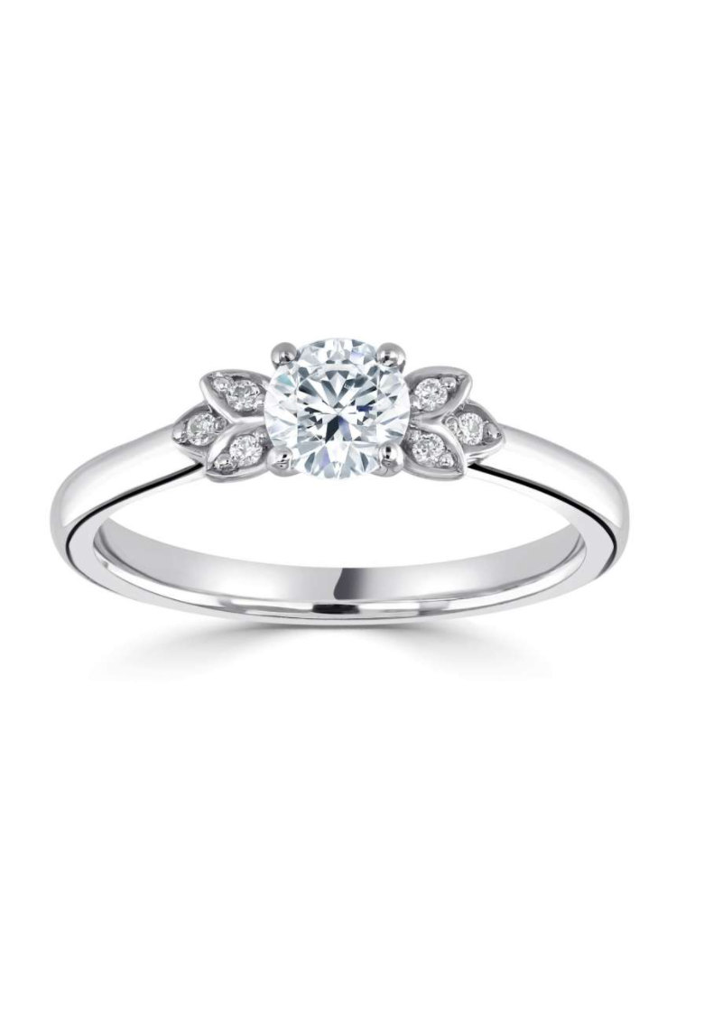 Our Vintage Floral Diamond Engagement Ring. Vintage in style with a centre solitaire diamond accented with twinkling diamonds set into leaf shapes. The dreamy vintage style of this beautiful ring will truly steal your heart. We choose each centre diamond for beauty and brilliance. Your centre diamond holds a certificate. The most important question when shopping for a diamond is "does it sparkle?" and this diamond truly sparkles. Set in precious Platinum, this is the perfect ring for a romantic engagement.